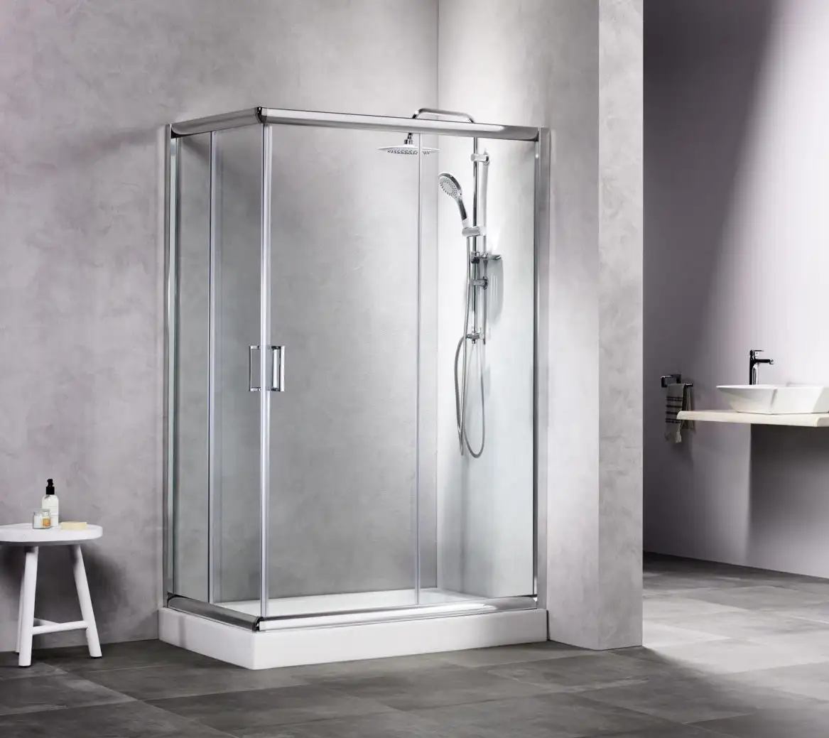 Καμπίνα NEW TEMA Παραλληλόγραμμη Διάφανη Βαρέως τύπου καμπίνα ντους, με δύο σταθερά φύλλα και δύο συρόμενες πόρτες.